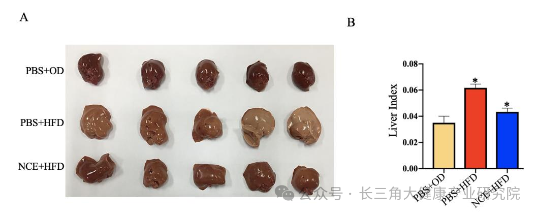 (注:A. NCE 干预 6 周后小鼠肝脏体积和色泽的变化;B. 计算肝脏指数,*P<0.05。)