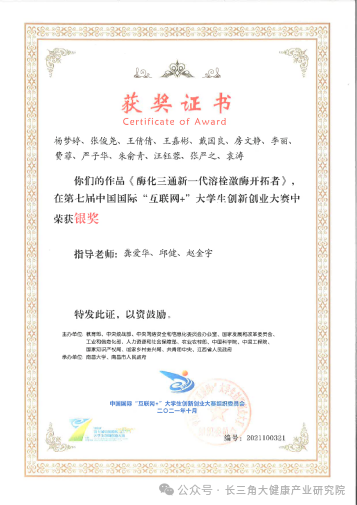除此以外,2021年,团队项目《酶化三通——新一代溶栓激酶开拓者》斩获第七届中国国际“互联网+”大学生创新创业大赛银奖,同时拿下江苏省选拔赛高教主赛道一等奖。