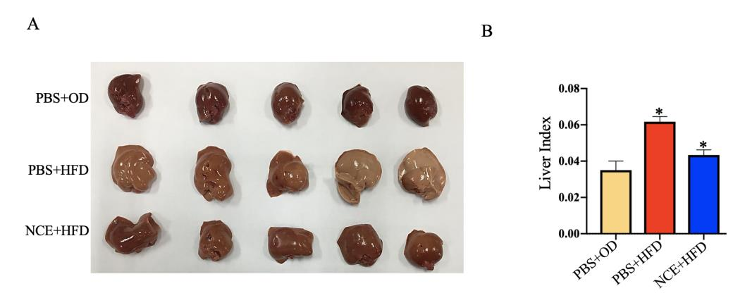 (注:A. NCE 干预 6 周后小鼠肝脏体积和色泽的变化;B. 计算肝脏指数,*P<0.05。)